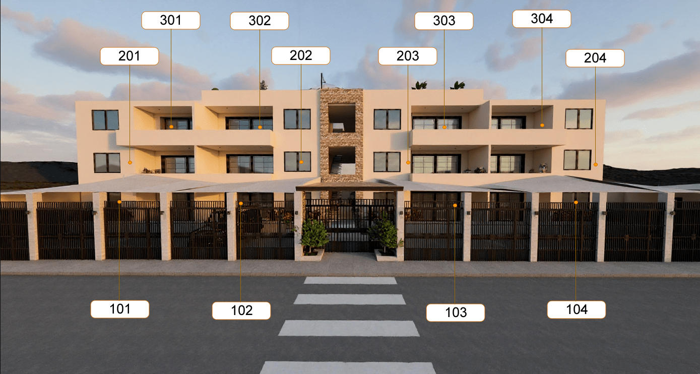 In this frontal image of our complex, you can see all the apartments available for sale. Explore our options and find the home that best suits your needs.